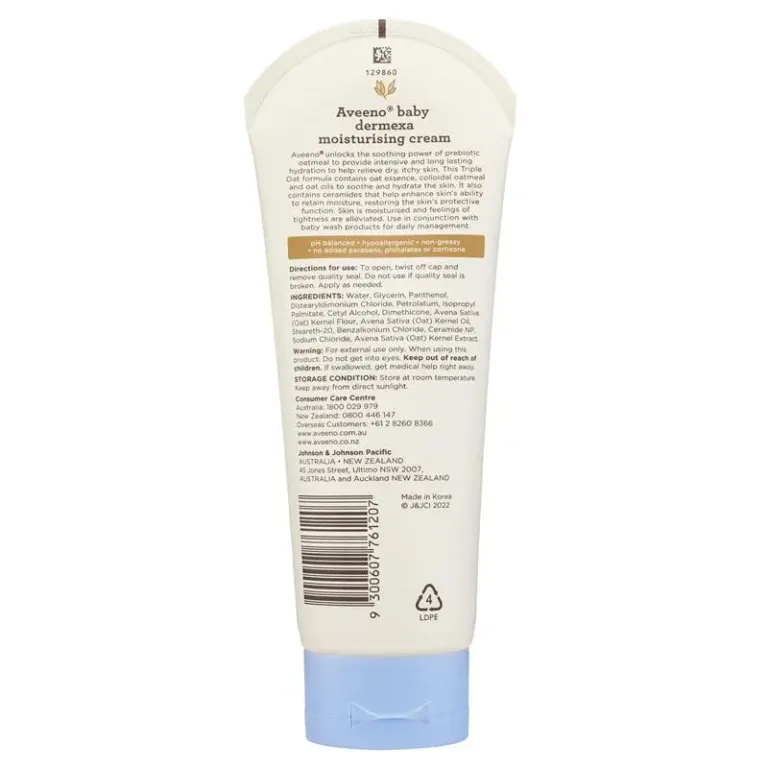 Aveeno Baby Dermexa Moisturising Cream is formulated with naturally active Triple Oat Complex to soothe and hydrate skin. It also contains ceramides that help enhance skin’s ability to retain moisture, restoring the skin’s protective function. This unique baby lotion works to soothe your baby’s dry, itchy skin, and is clinically proven suitable for eczema-prone skin. The advanced body lotion formulation helps to reduce the appearance of redness and scaling, helping to restore the skin barrier and put dry, uncomfortable skin at ease. Skin is moisturised and feelings of tightness are alleviated.