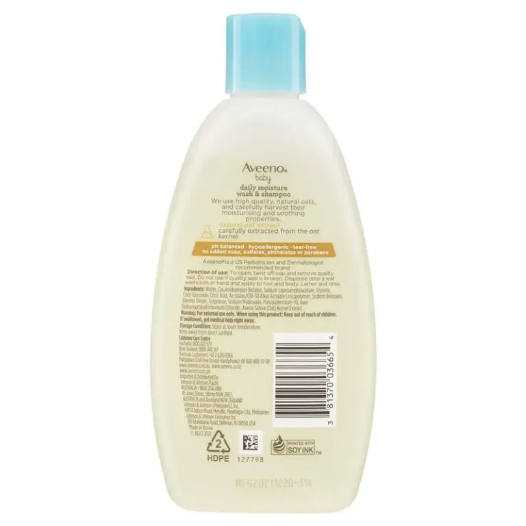 Aveeno Baby Daily Moisture Wash & Shampoo cleanses skin and hair without drying, making it ideal for everyday use. It is formulated with natural oat to be gentle for babies’ sensitive skin.