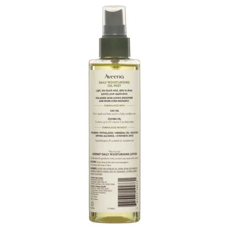 Aveeno Daily Moisturising Oil Mist is a light, dry-touch body oil formulated with Oat Oil and Jojoba Oil to condition and nourish dry, rough skin. With 98% naturally derived ingredients, it delivers smoother, more even-looking skin in just 1 week.