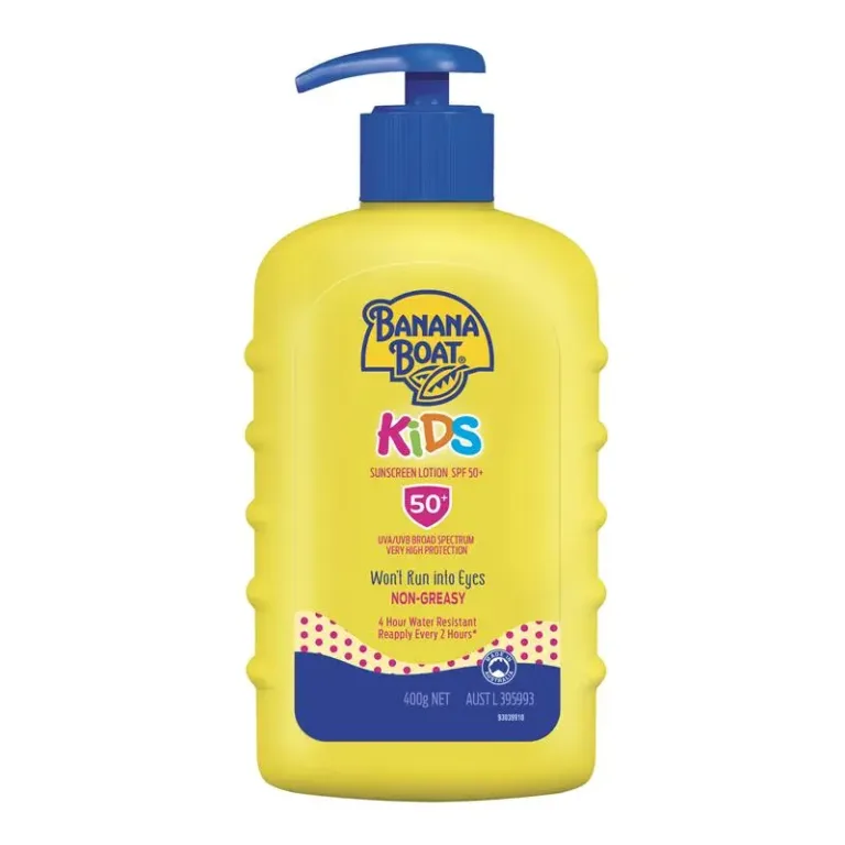 Banana Boat® Kids Sunscreen Lotion SPF50+ is specially formulated with a mild, fragrance-free formula that is gentle on children’s delicate skin. Designed to not run into eyes, this lightweight, non-greasy sunscreen provides very high broad-spectrum UVA/UVB protection and up to 4 hours water resistance.