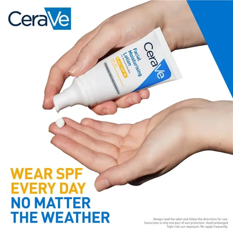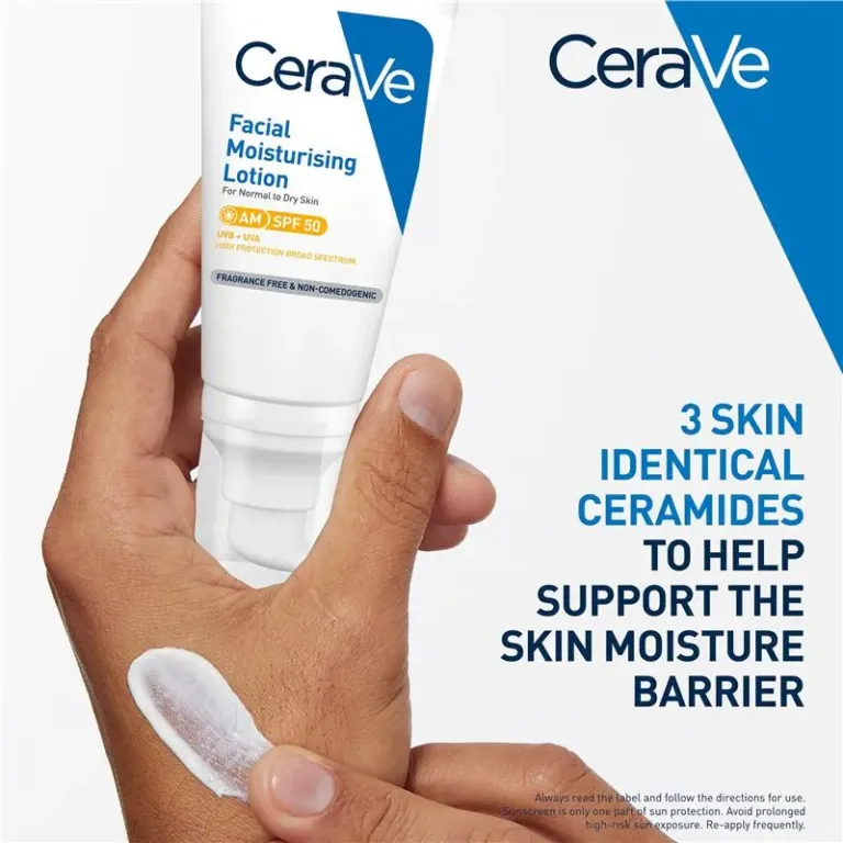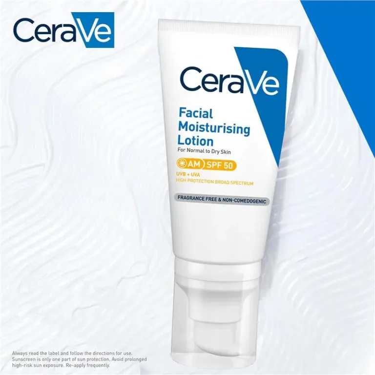 CeraVe Sunscreen Face Lotion SPF 50 is a 2-in-1 sunscreen and moisturizer that provides broad-spectrum UV protection while hydrating the skin. Formulated with 3 essential ceramides, hyaluronic acid, niacinamide, and MVE Technology, it helps support the skin’s moisture barrier, retain hydration, and soothe the skin. This lightweight, non-greasy lotion is ideal for normal to dry skin types and helps protect against premature skin aging while potentially reducing the risk of certain skin cancers.