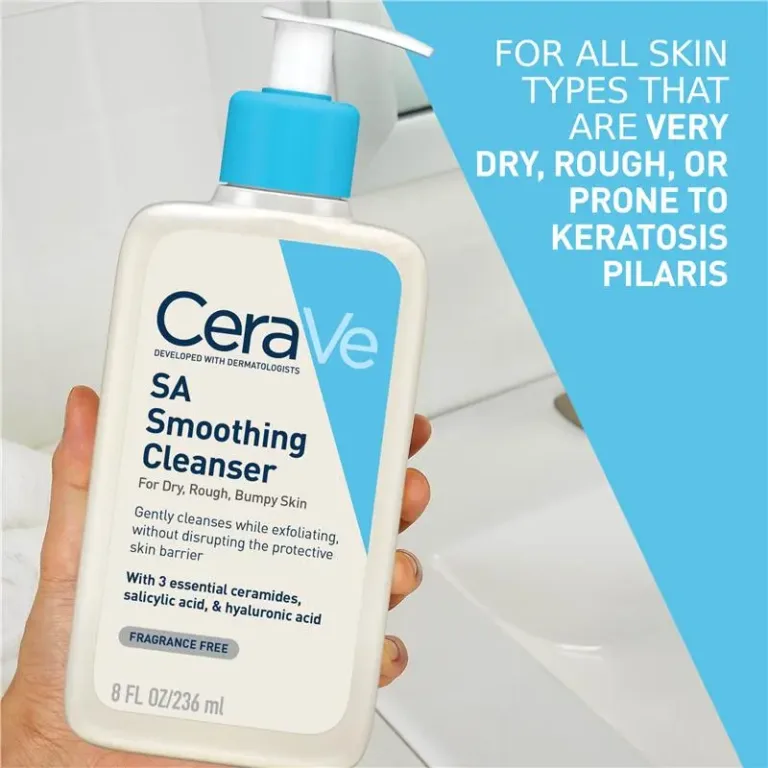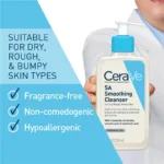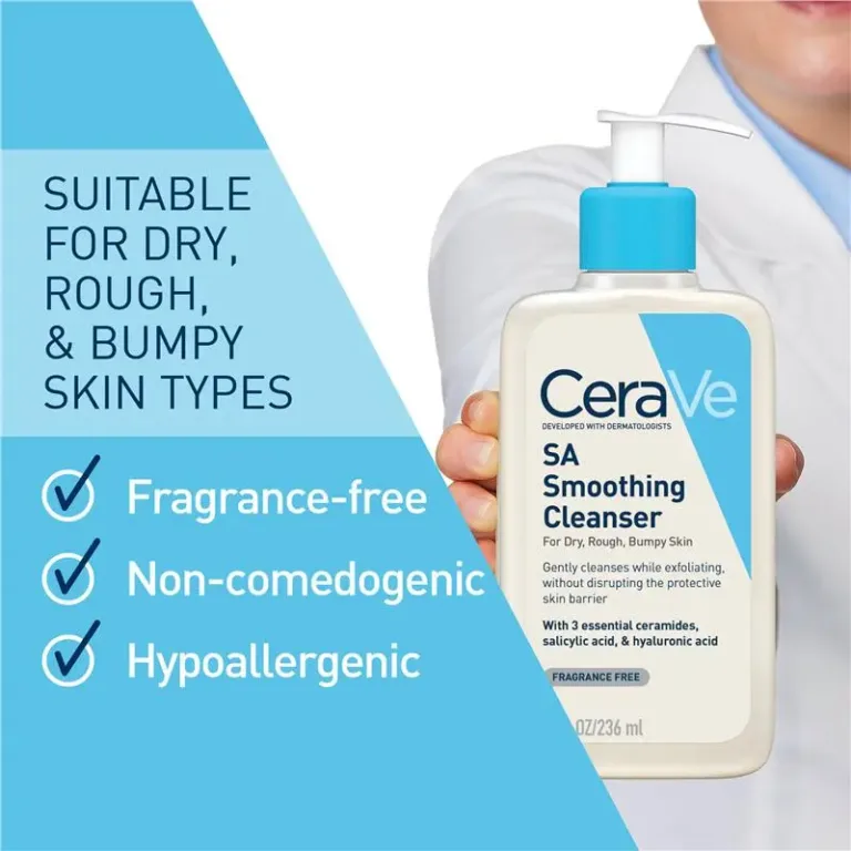 CeraVe SA Smoothing Cleanser is a gentle BHA face and body wash formulated for dry skin. It helps cleanse, soften, and smooth rough or bumpy skin prone to redness. Enriched with salicylic acid, ceramides, hyaluronic acid, niacinamide, and antioxidant vitamin D, it helps exfoliate, retain moisture, calm the skin, and restore the skin’s natural barrier. Developed with dermatologists, this non-comedogenic, allergy-tested, and fragrance-free formula is suitable for daily use on both face and body.