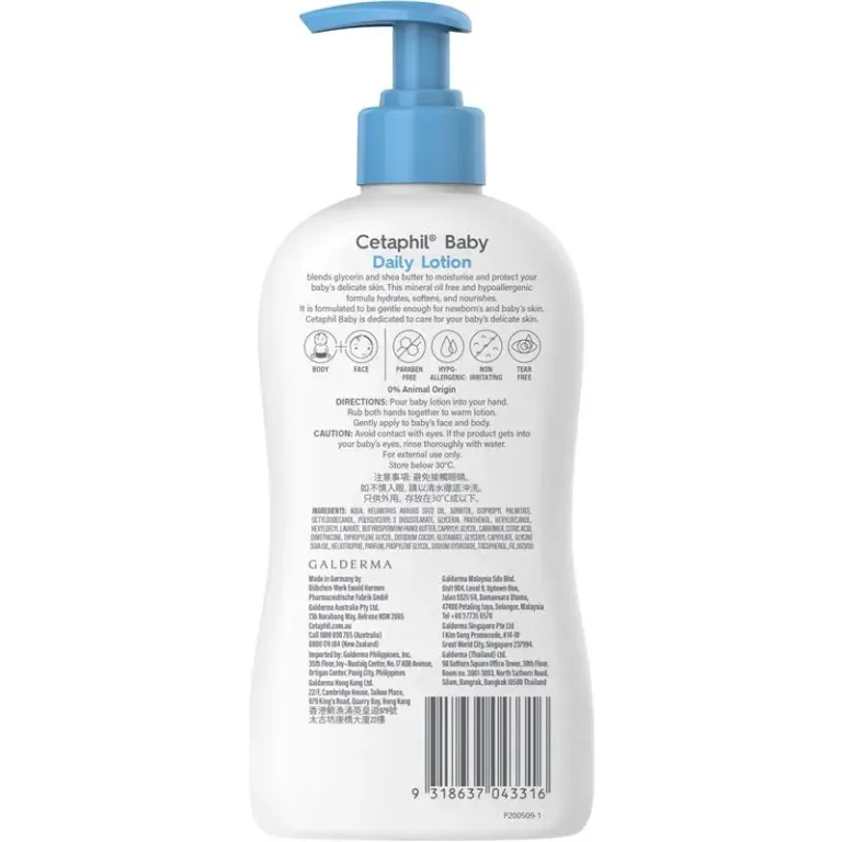 Cetaphil Baby Daily Lotion with Shea Butter, Vitamin E and Pro-Vitamin B5 gently hydrates, softens, and nourishes your baby’s delicate skin while helping to preserve its natural protective moisture barrier.