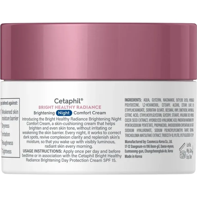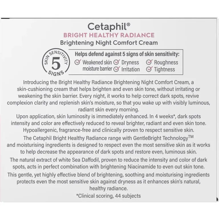 Cetaphil Bright Healthy Radiance Brightening Night Comfort Cream is a gentle yet effective night cream that helps reduce dark spots and restore an even, radiant complexion. Formulated with GentleBright Technology, it combines natural White Sea Daffodil extract—clinically proven to reduce the intensity and color of dark spots—with Niacinamide (Vitamin B3) to visibly brighten skin tone.
