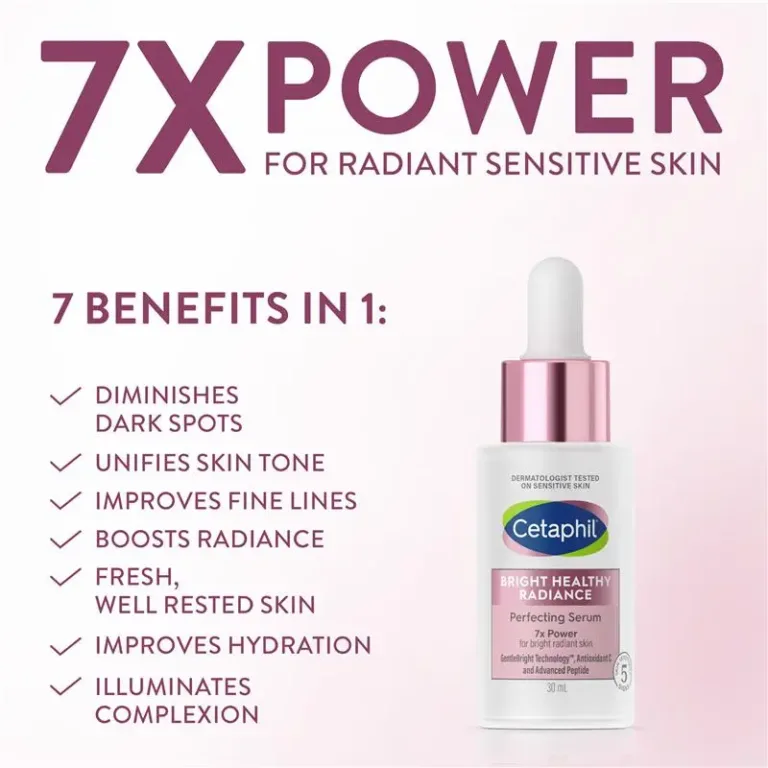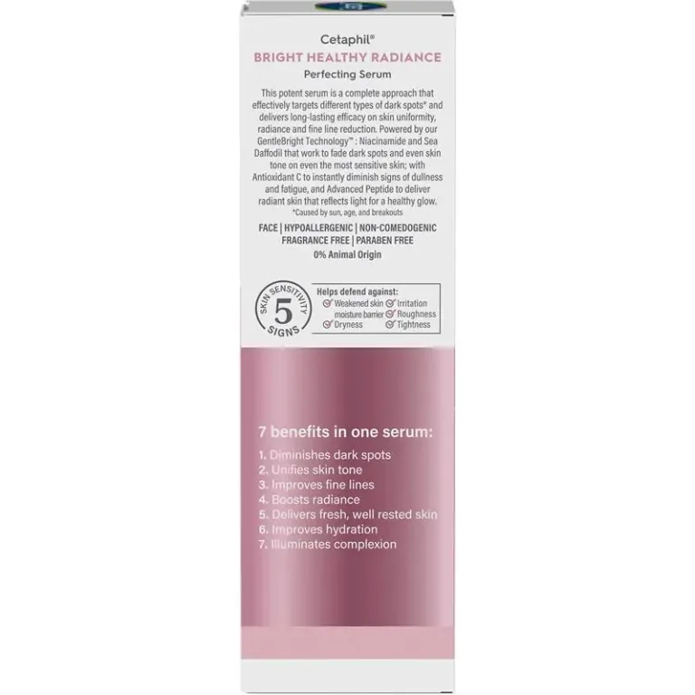 Cetaphil Bright Healthy Radiance Perfecting Serum delivers 7x the benefits for radiant, sensitive skin. Formulated with next-generation GentleBright Technology™, it combines Sea Daffodil to reduce the appearance of dark spots and Niacinamide to even skin tone. Infused with Antioxidant C and Advanced Peptide, it helps visibly reduce dark spots in as fast as 14 days.