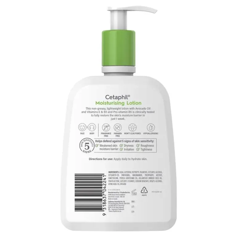 Cetaphil Moisturising Lotion instantly soothes dry to normal and sensitive skin while providing long-lasting protection from dryness for up to 48 hours. Formulated with Avocado Oil, Pro-Vitamin B5, and Vitamins E and B3, this lightweight, non-greasy lotion restores the skin’s moisture barrier and is suitable for daily use on both face and body. Hypoallergenic and fragrance-free, it is gentle enough for sensitive skin and dermatologist-recommended.