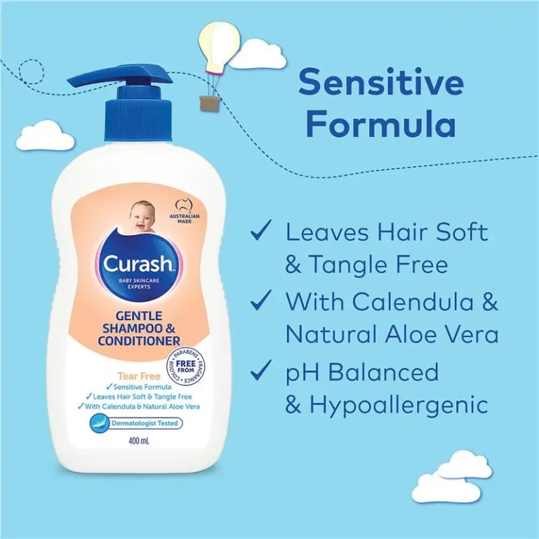Curash Gentle Shampoo & Conditioner is specially formulated for babies’ delicate hair and scalp. With a mild, tear-free formula enriched with natural Aloe Vera and Calendula, it gently cleanses while helping to moisturise the scalp, leaving hair soft, shiny, and tangle-free.
