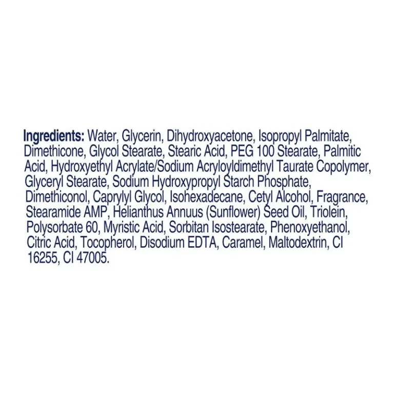 Water, Glycerin, Dihydroxyacetone, Isopropyl Palmitate, Dimethicone, Glycol Stearate, Stearic Acid, PEG-100 Stearate, Palmitic Acid, Hydroxyethyl Acrylate/Sodium Acryloyldimethyl Taurate Copolymer, Glyceryl Stearate, Sodium Hydroxypropyl Starch Phosphate, Dimethiconol, Caprylyl Glycol, Isohexadecane, Cetyl Alcohol, Fragrance, Stearamide AMP, Helianthus Annuus (Sunflower) Seed Oil, Triolein, Polysorbate 60, Myristic Acid, Sorbitan Isostearate, Phenoxyethanol, Citric Acid, Tocopherol, Disodium EDTA, Caramel, Maltodextrin, CI 16255, CI 47005.