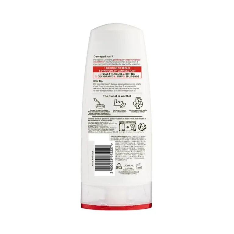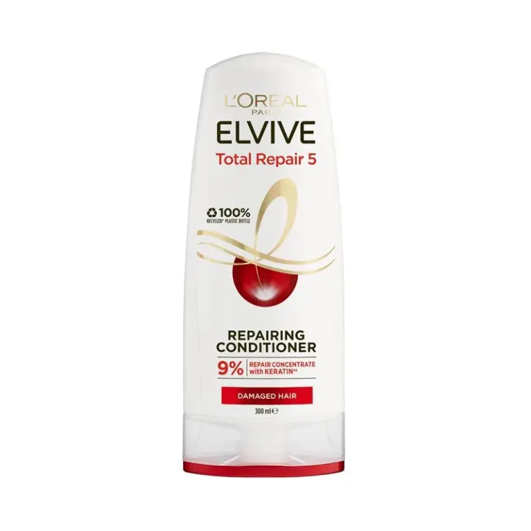 L’Oréal Paris Elvive Total Repair 5 Conditioner is enriched with 9% Pro-Keratin and Ceramides to repair 5 common hair problems: strawlike texture, brittleness, dehydration, stiffness, and split ends.