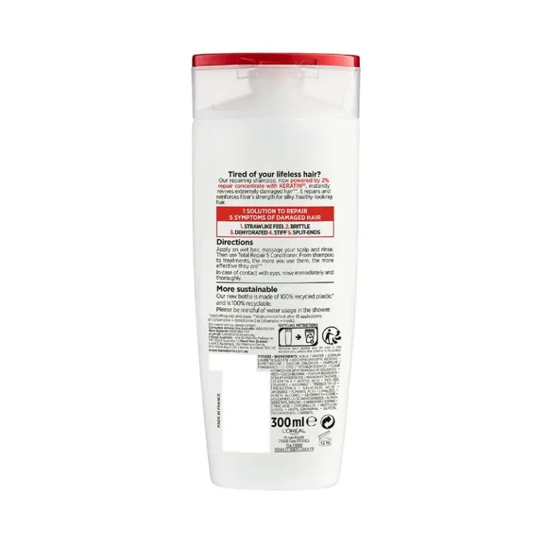 Apply to wet hair, gently massage the scalp, and rinse thoroughly. For best results, follow with L’Oréal Paris Elvive Total Repair 5 Conditioner. Consistent use of the full Total Repair 5 range enhances effectiveness.