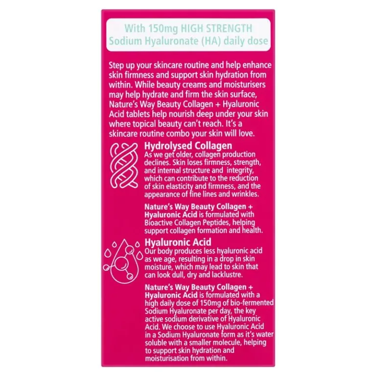 Nature’s Way Beauty Collagen + Hyaluronic Acid Tablets are designed to support skin firmness, hydration, and elasticity from within.