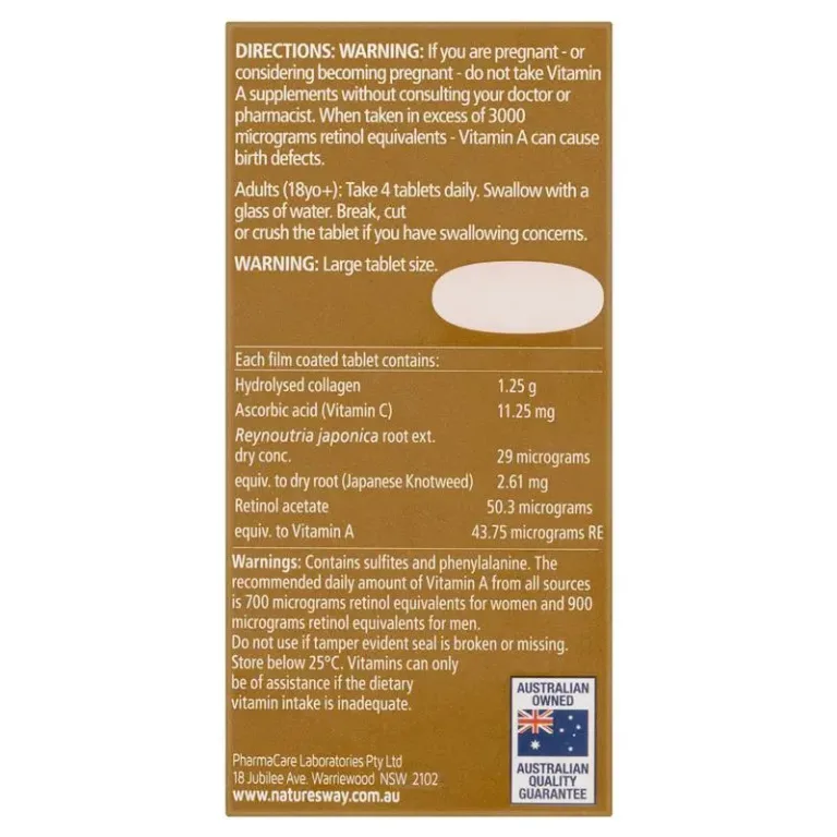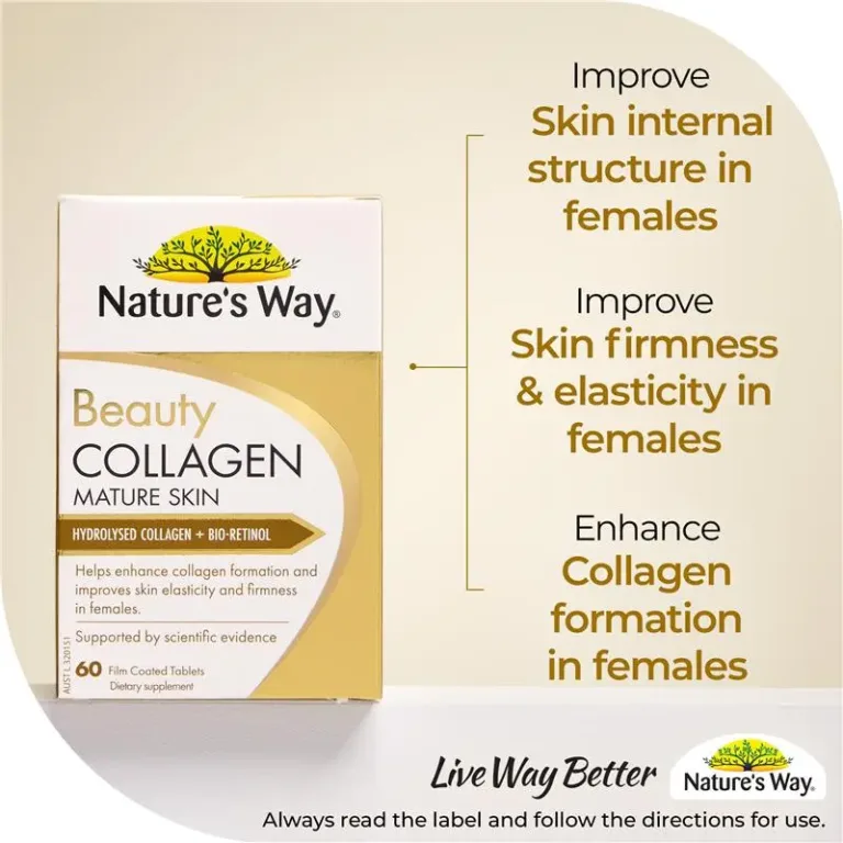 Nature’s Way Beauty Collagen Mature Skin Hydrolysed Collagen + Bio-Retinol is scientifically formulated to support collagen formation, skin elasticity, and firmness in women.